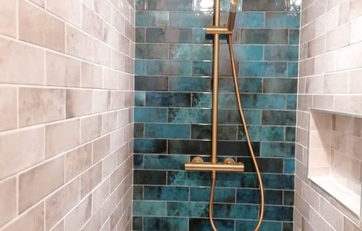 Réalisation d’une SDD en briquettes turquoises et beiges.   Produits : Sol – 20×120 Cherry Cerise Rectifié. Murs – 7.5×22.5…