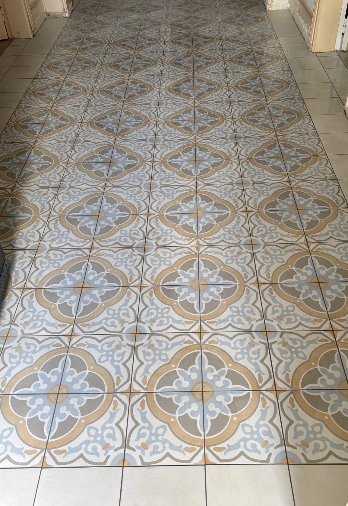 Sol Entrée – Aspect Carreaux de Ciment Produits : 20×20 Rêverie Dec-9 Rectifié, 20×20 Rêverie Blanc Rectifié. Réalisation : Entreprise Eric FLOC’H – QUIMPER.